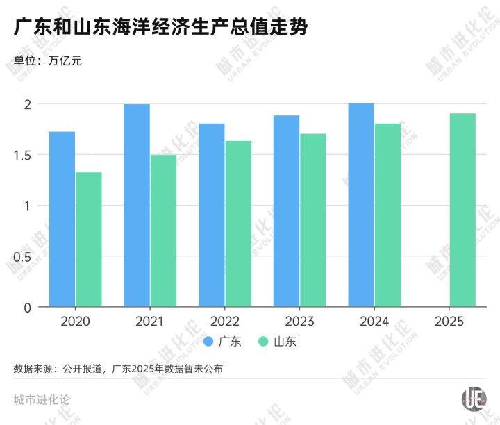 尽管广东2025年数据尚未公布,但从当年几年数据看,山东和广东的海洋分娩总值差距彰着收缩——2020年,广东、山东海洋分娩总值分别为1.72万亿元、1.32万亿元,收支约4000亿元;到2024年,二者海洋分娩总值分别增长至2万亿元、1.8万亿元,差距收窄至2000亿元附近。