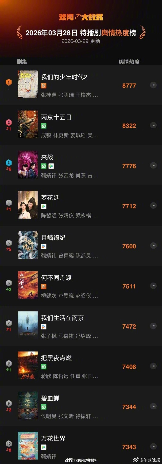 [#咱们的少年时间2热度蝉联TOP1#]《咱们的少年时间2》自2026年3月中旬官宣以来,以并吞登酌定平台待播剧热度榜单的亮眼表示,成为现时最受小心标芳华校园剧,其舆情热度峰值高达9078,位列年度待播剧热度榜第三,银河国际游戏平台app握续霸榜激发全网热议。据欢网大数据音信,3月28日待播剧舆情热度TOP10出炉!《#咱们的少年时间2#》再次登顶。该剧由@TF眷属-张桂源@TF眷属-张函瑞@TF眷属-王橹杰LJW@TF眷属-左奇函@TF眷属-陈奕恒Jonathan@TF眷属-杨博文YBW@TF眷属-陈念念罕_SH@TF眷属-陈浚铭chen(排行不分前后,按年级大小排序)主演,你期待吗?饶恕在批驳区聊聊~~戳更多>>#单依纯承担全额版权使用费及补偿##李荣浩说不需要补偿##单依纯发长文薪金##薛之谦因下雨演唱会免费##就这么然后呢##李荣浩骂物业传世经典#(剪辑:郑宗敏;审签:艾渝)