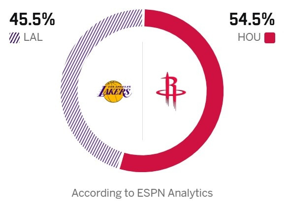 今天,ESPN掂量本场比赛胜率,湖东说念主45.5%,hg真人火箭54.5%。
