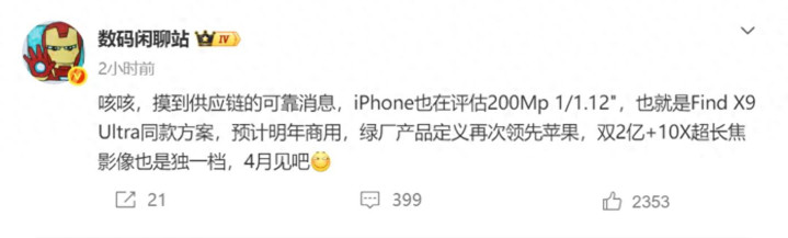 供应链哪里传出的音尘泄漏,苹果里面正在豪恣测试一套两亿像素的超大底主摄决策。